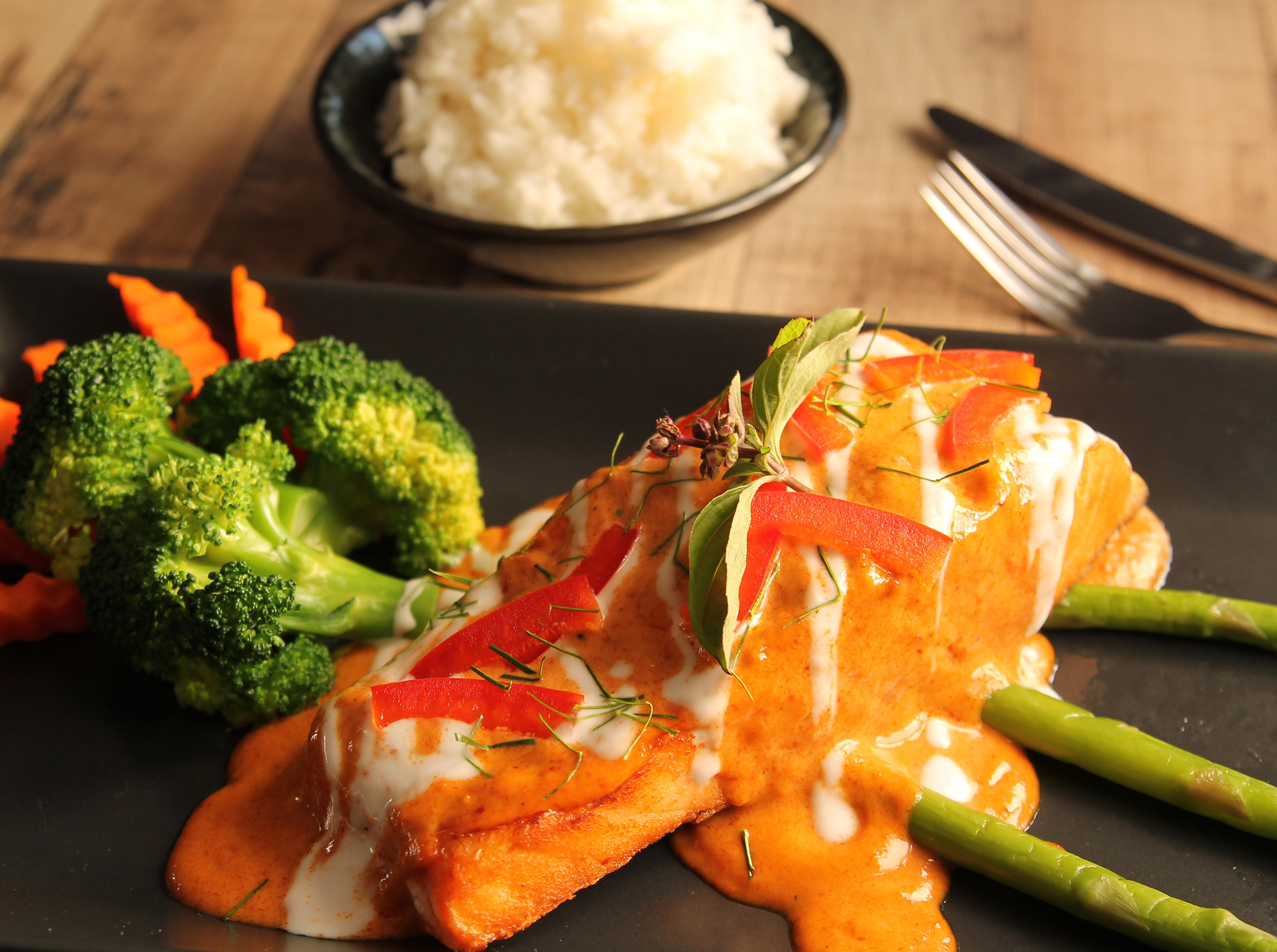 - Grilled salmon fillet with choo chee curry sauce , lime leave and vegetable.