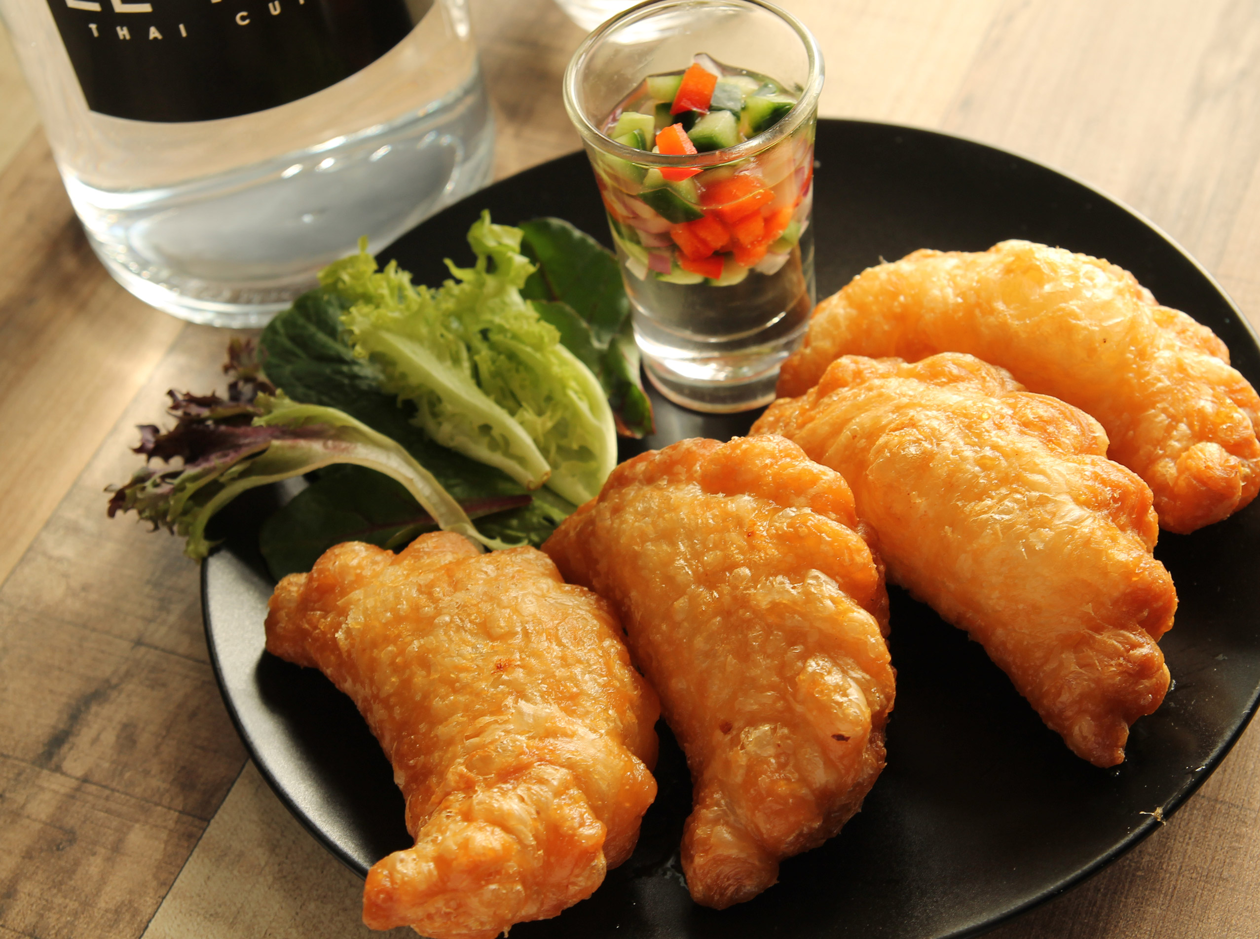 - Minced beef and vegetable wrapped in puff pastry , deep fried , served with cucumber sauce.