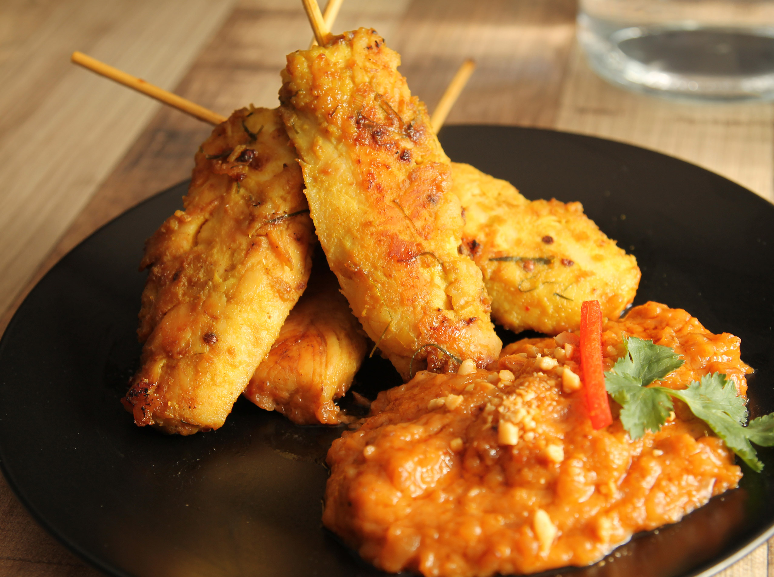 - Marinated chicken grilled on a skewer topped with thai peanut sauce.