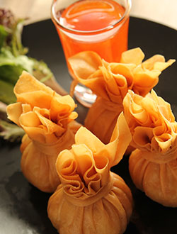 - Minced chicken, clear noodles, carrot and back fungus folded into a spring roll pastry, deep fried, served with sweet chill sauce.