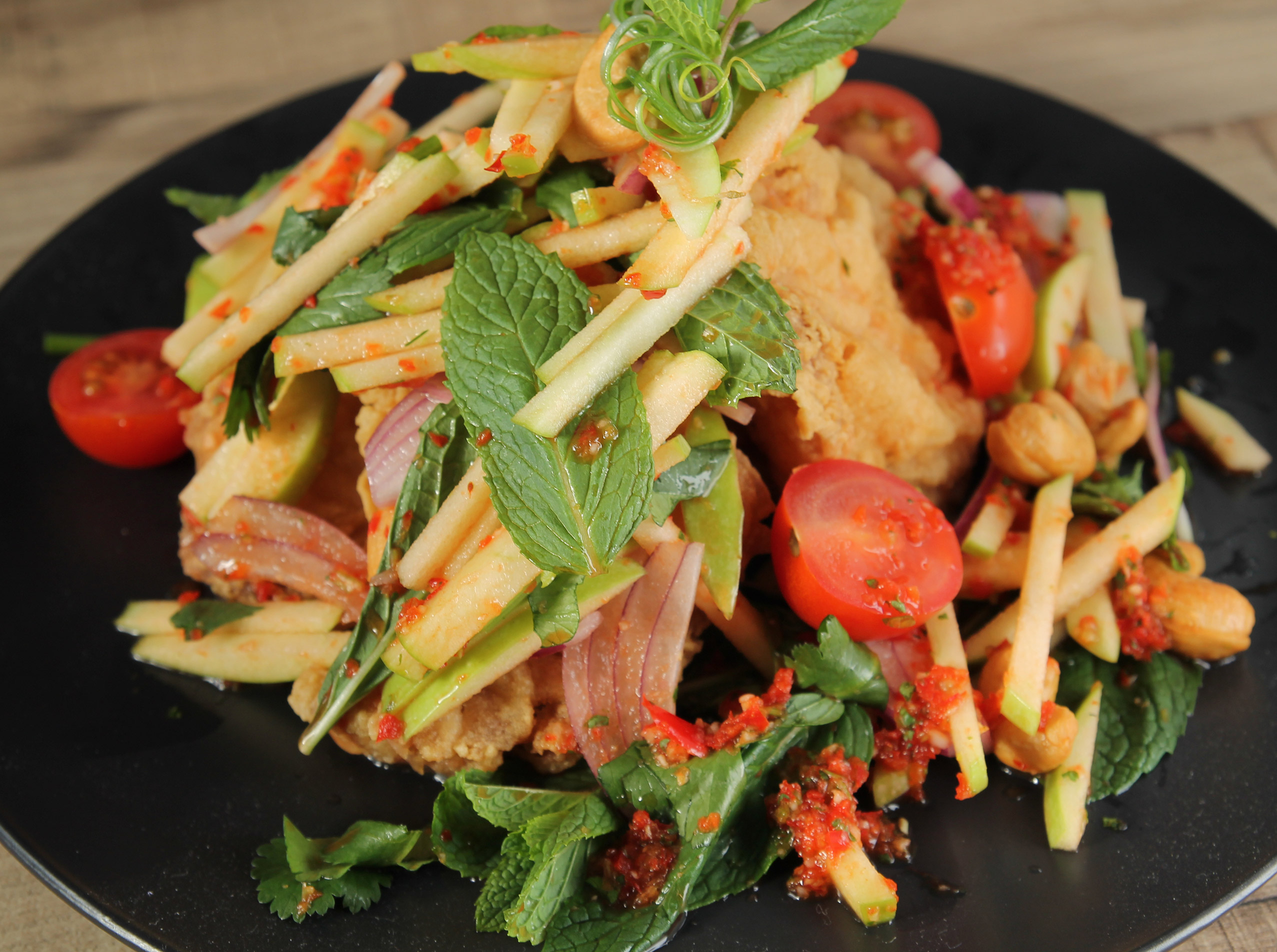 - Barramundi fillets battered, deep fried and topped with spicy dressing salad , green apple.